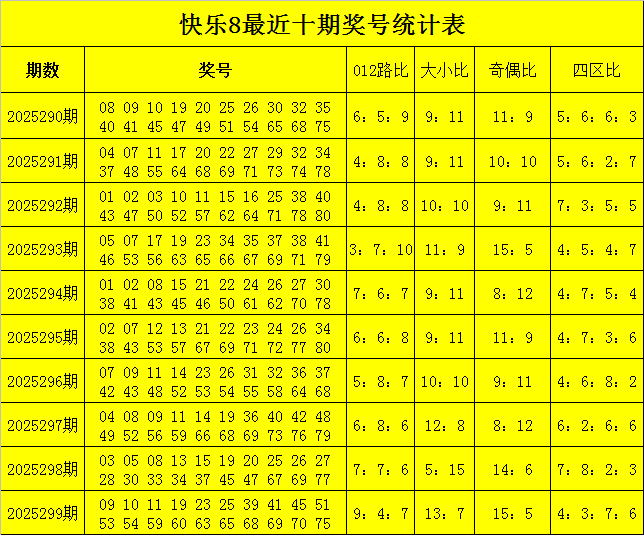 福彩快乐8第2025299期开奖回顾:09 10 11 19 23 25 39 41 45 51 53 54 59 60 63 65 68 69 70 75,其中奖号012路比为9:4:7,和值为909,跨度为66,奇偶比为15:5。